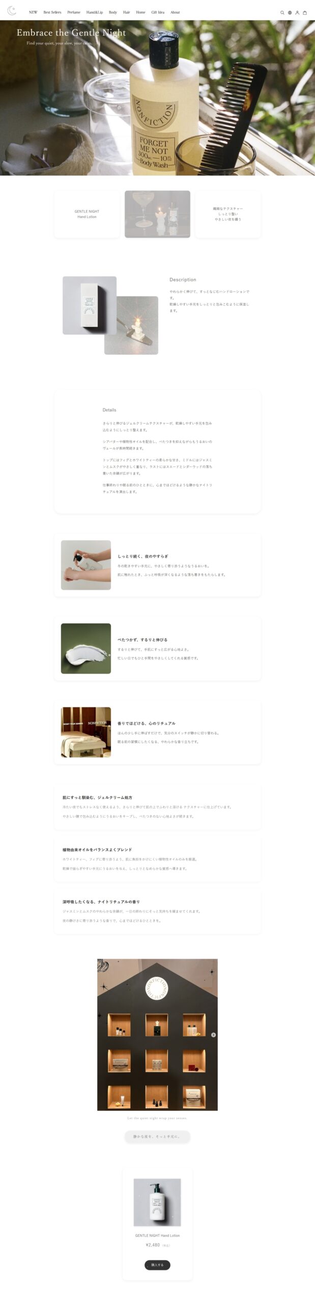 スキンケアブランド「GENTLE NIGHT」のハンドローション販促用ランディングページを想定して制作。